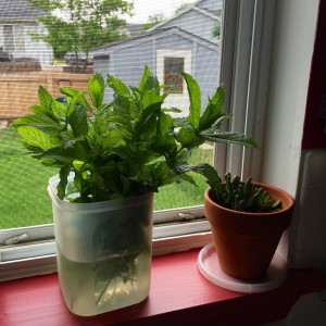 Keep a “vase” of washed mint branches somewhere convenient, and put a sprig or a few leaves in a glass of water (or iced tea, or LaCroix) whenever. Or fill a water bottle or pitcher with water and add washed mint leaves. Take to the office or keep around the house, and you might just drink more water that day.