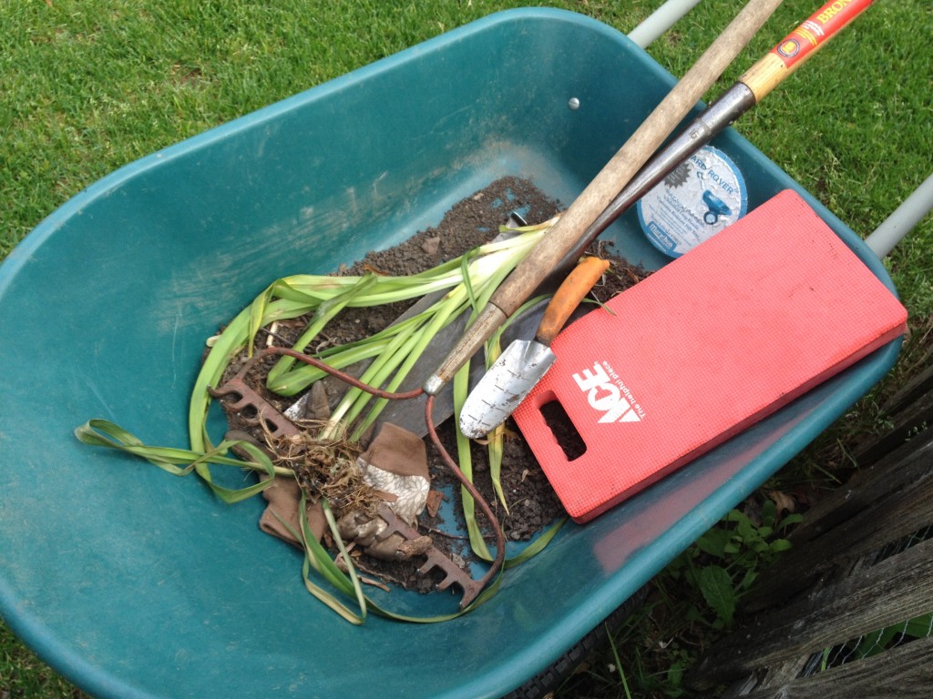“Keepin’ it real” (as The Pioneer Woman would say). My dirty tools and wheelbarrow. Still sitting by the fence – I should probably put them in the shed before the rainstorms today, huh?